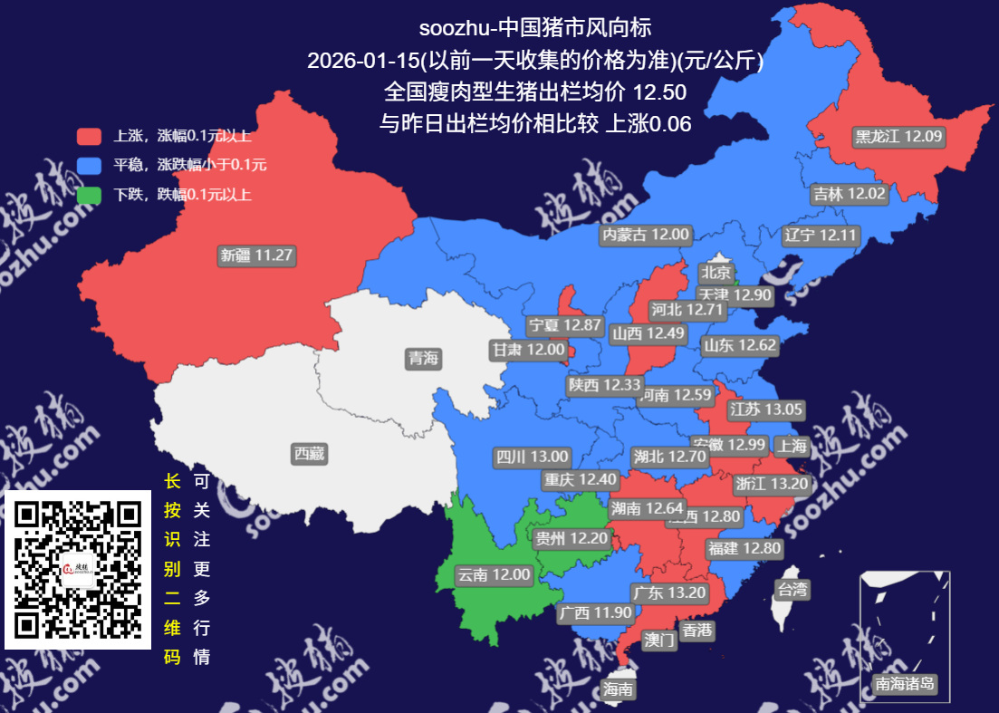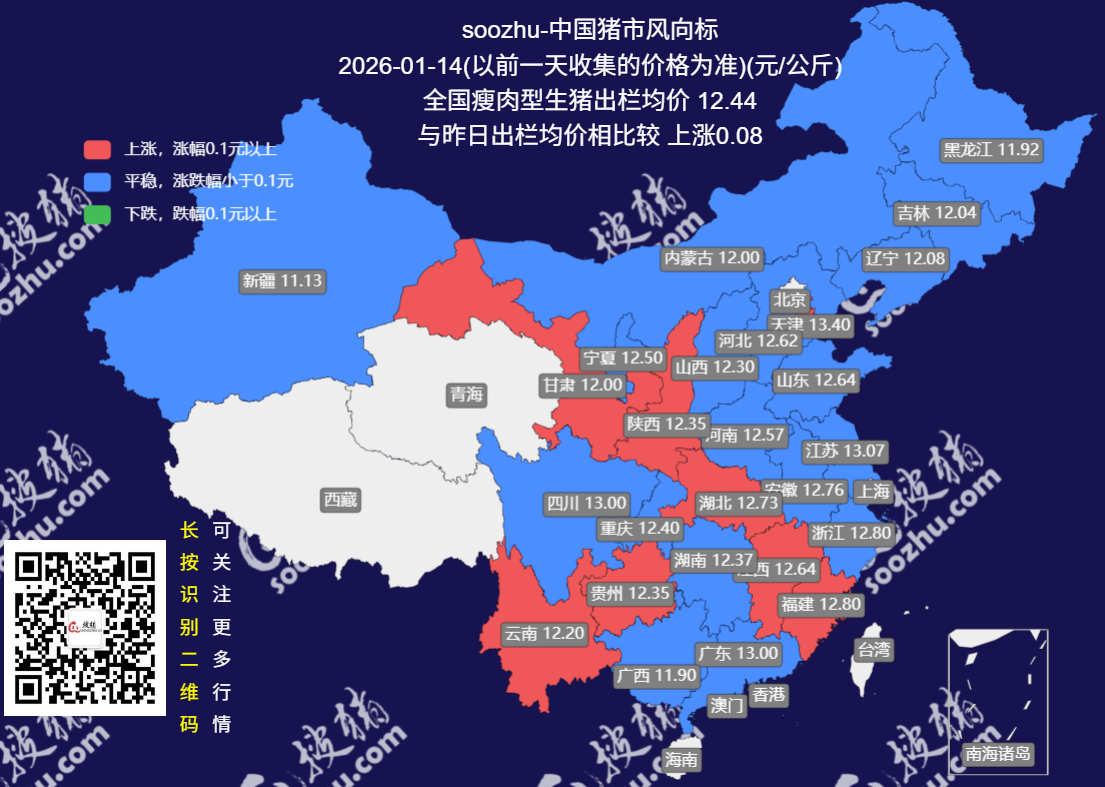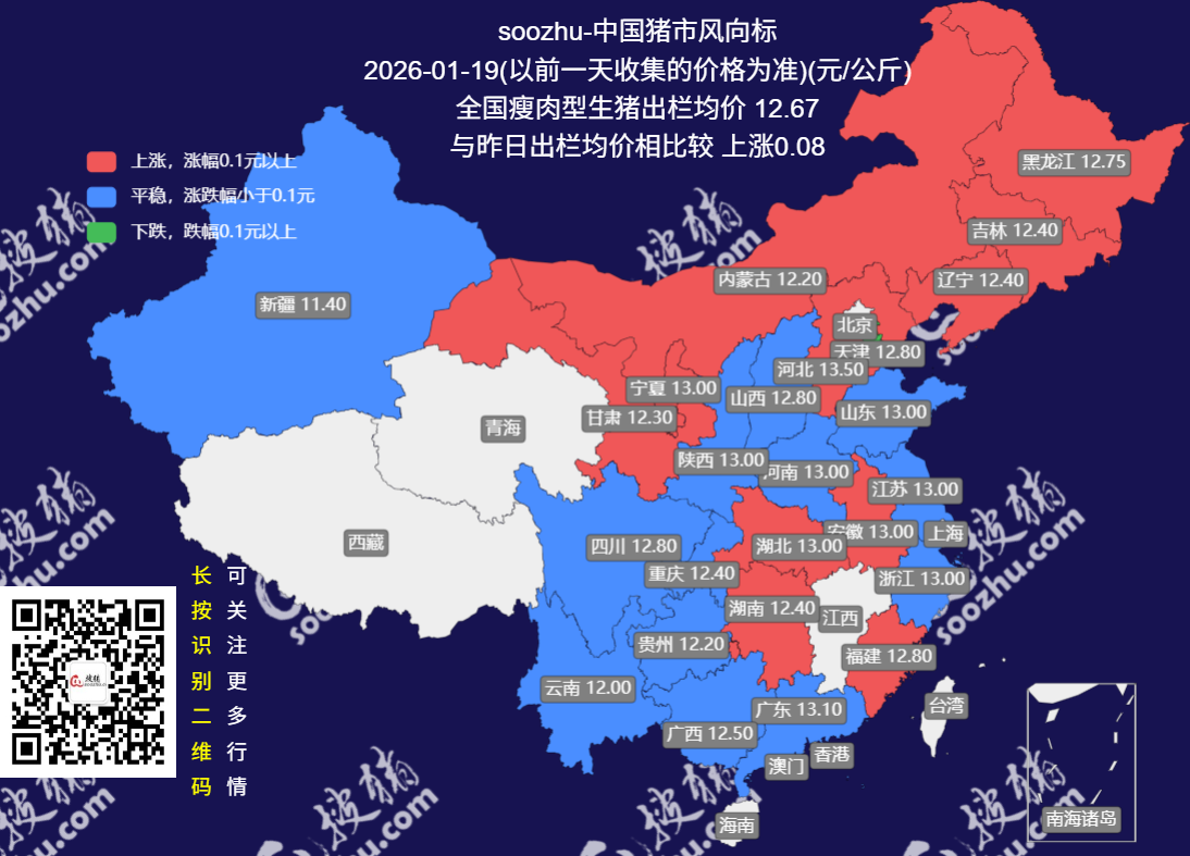 今日全国瘦肉型猪出栏均价12.67元/公斤,较昨日上涨了0.08元/公斤[详情]
