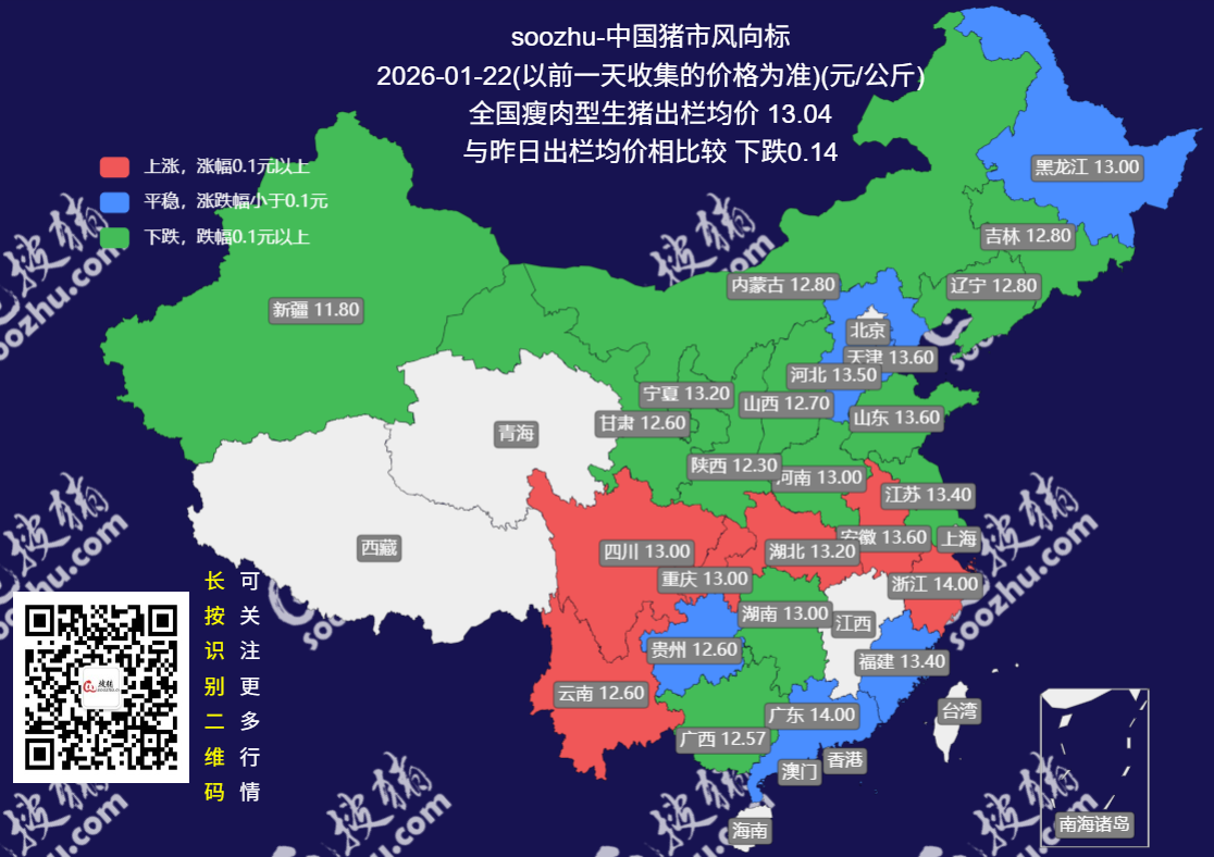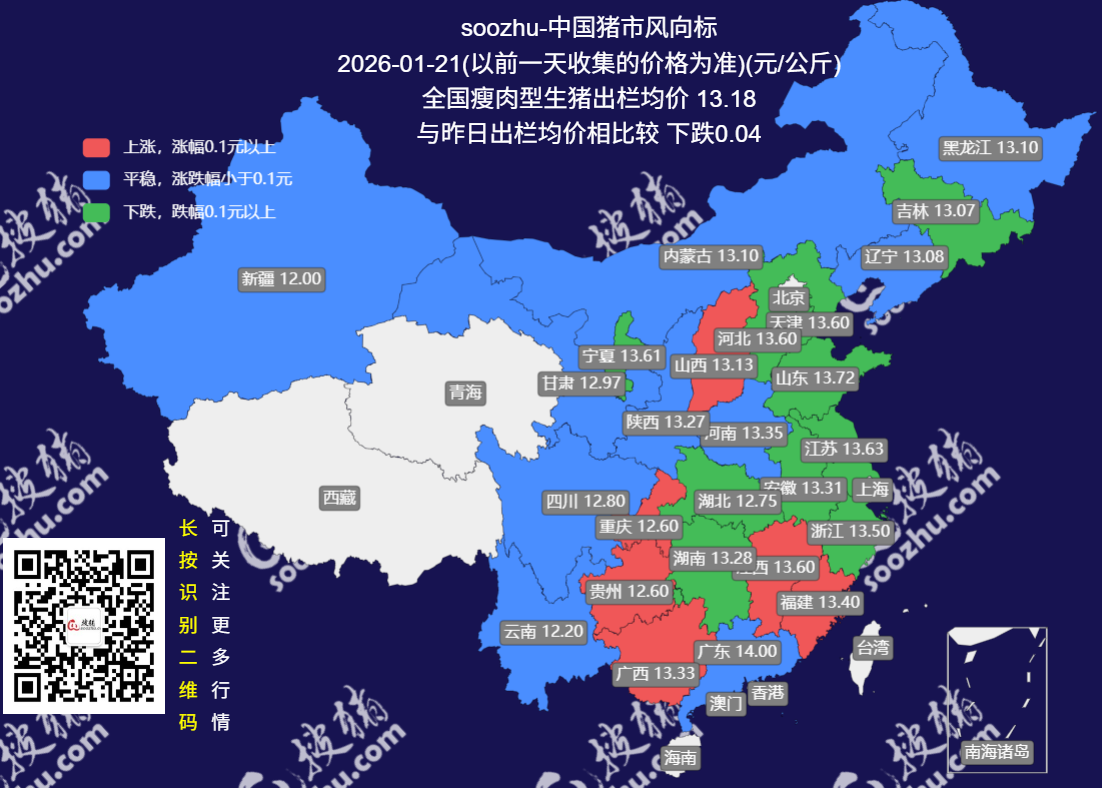 今日全国瘦肉型猪出栏均价13.18元/公斤,较昨日下跌了0.04元/公斤[详情]