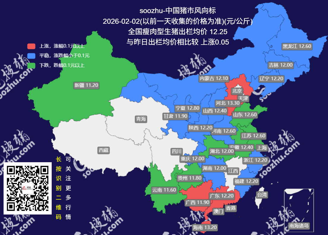 今日全国瘦肉型猪出栏均价12.25元/公斤,较昨日上涨了0.05元/公斤[详情]
