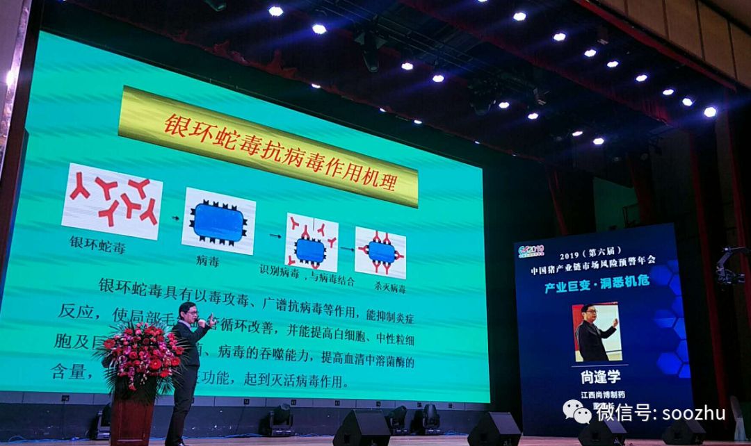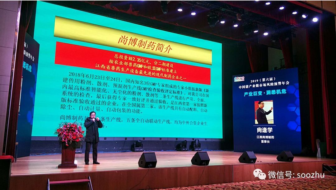 2019(第六届)中国猪产业链市场风险预警年会中,各大兽药企业、饲料企业、添加剂企业、设备企业的代表也云聚于此。其中,来自江西尚博制药有限公司的董事长尚逢学先生,给大家介绍了尚博制药及旗下产品——紫蟾新品发布的一些情况等。