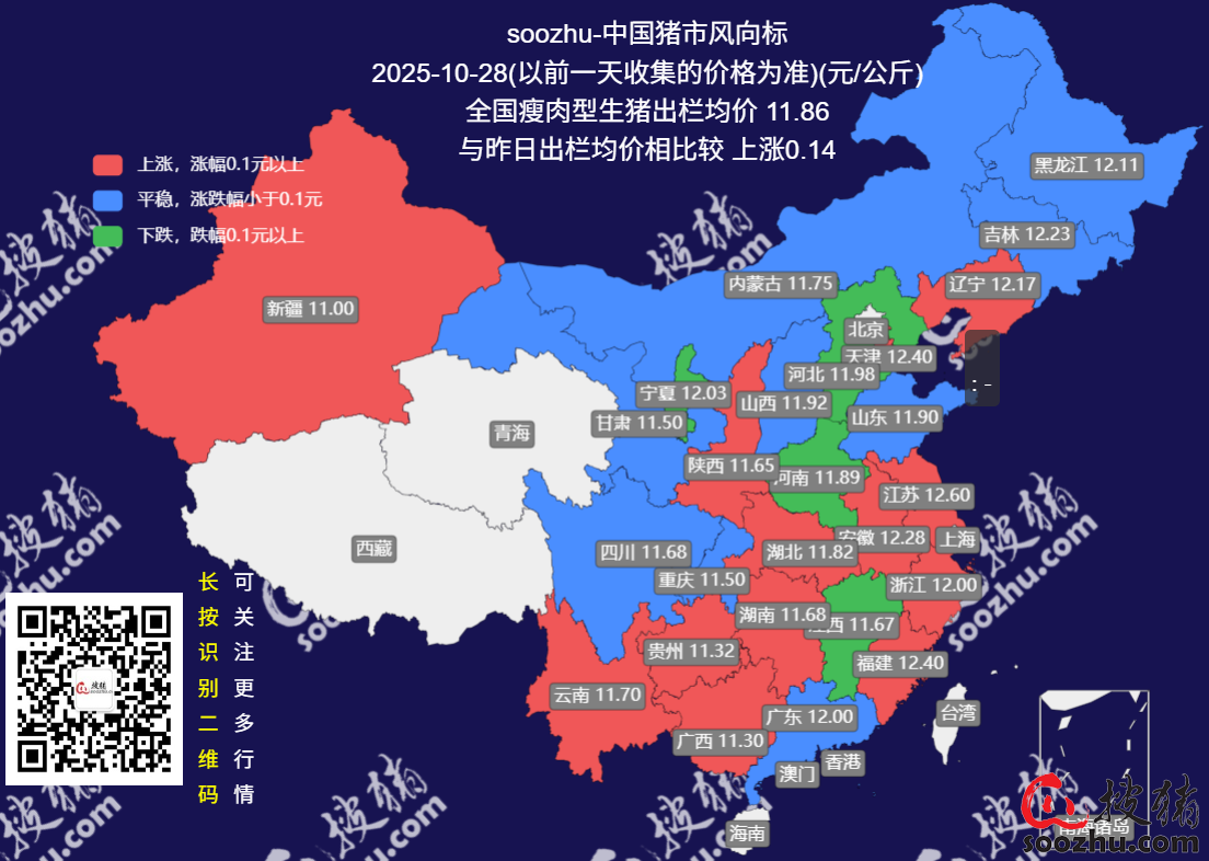 10月28日评:今日全国瘦肉型猪出栏均价11.86元/公斤