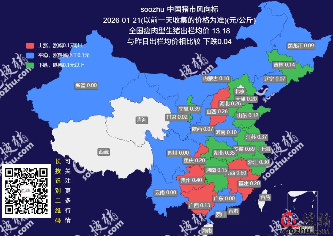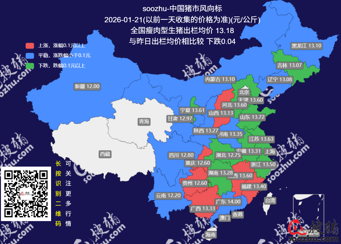 1月21日评:今日全国瘦肉型猪出栏均价13.18元/公斤
