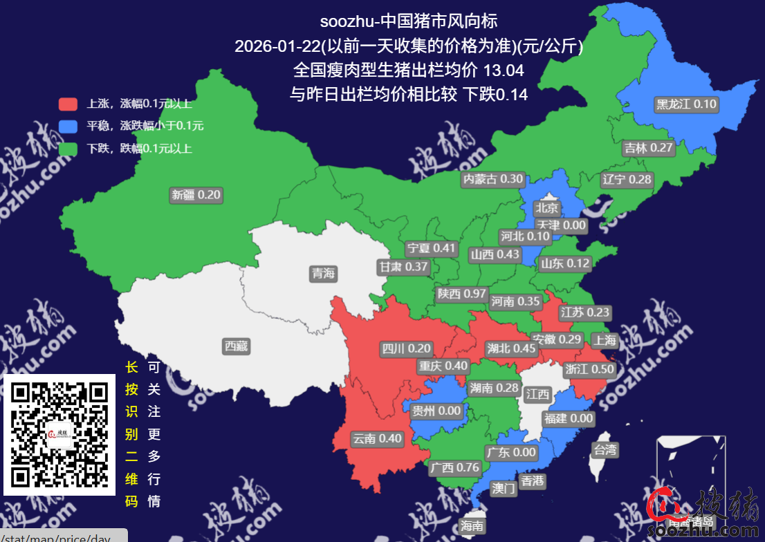 1月22日评:今日全国瘦肉型猪出栏均价13.04元/公斤