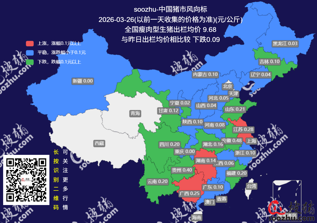 3月26日评:今日全国瘦肉型猪出栏均价9.68元/公斤