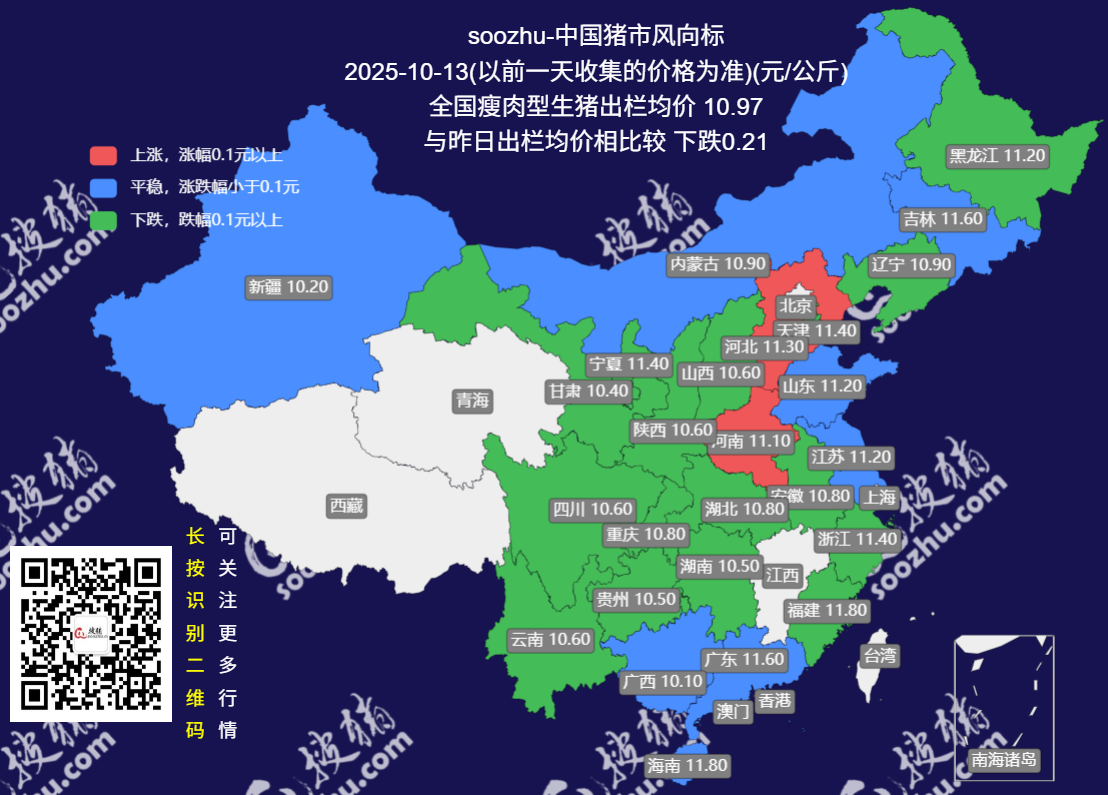 今日全国瘦肉型猪出栏均价10.97元/公斤,较昨日下跌了0.21元/公斤[详情]