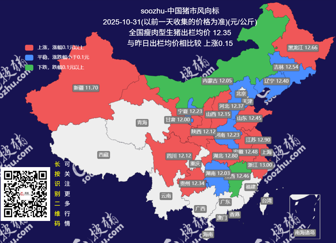 今日全国瘦肉型猪出栏均价12.35元/公斤,较昨日上涨了0.15元/公斤[详情]