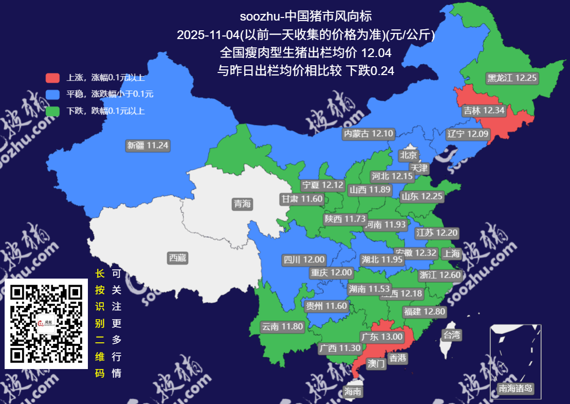 今日全国瘦肉型猪出栏均价12.04元/公斤,较昨日下跌了0.24元/公斤[详情]