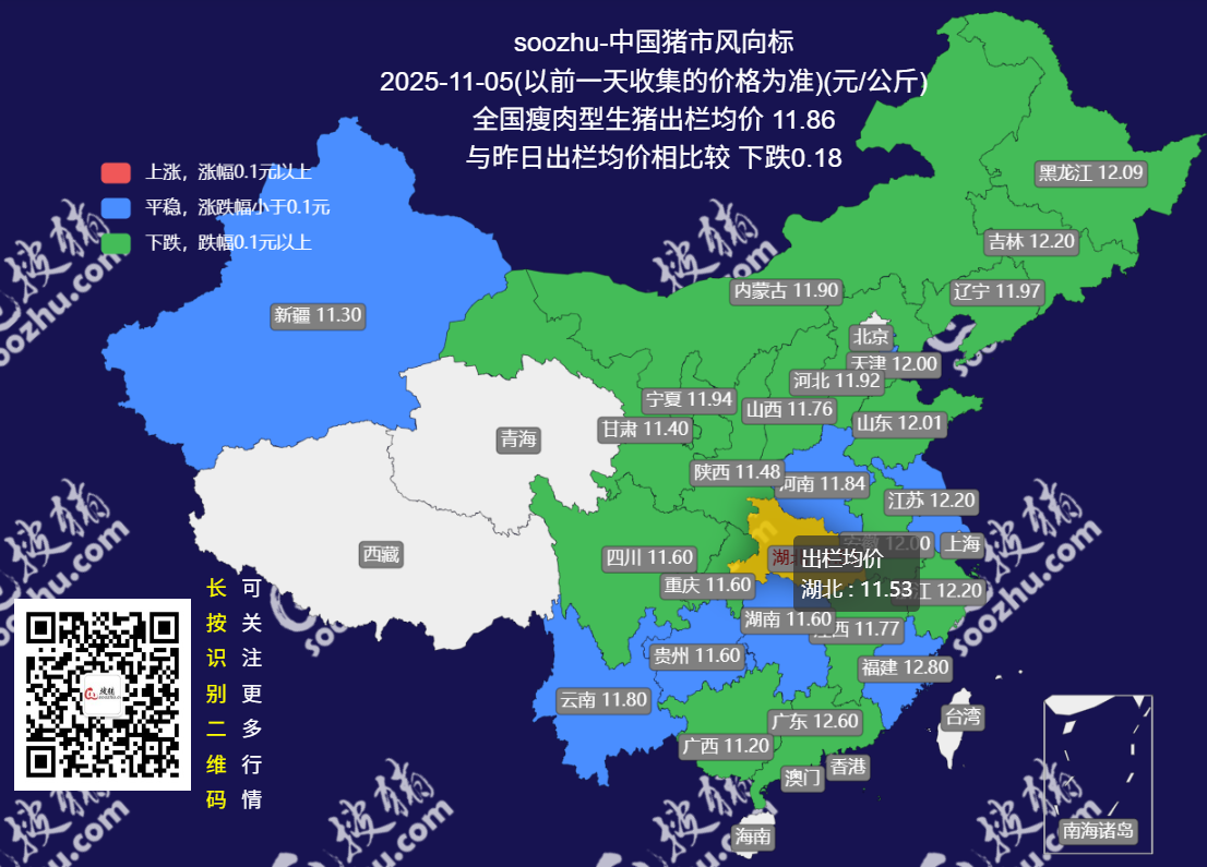 今日全国瘦肉型猪出栏均价11.53元/公斤,较昨日下跌了0.06元/公斤[详情]