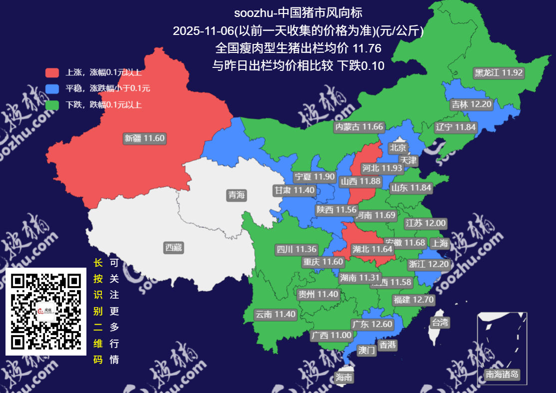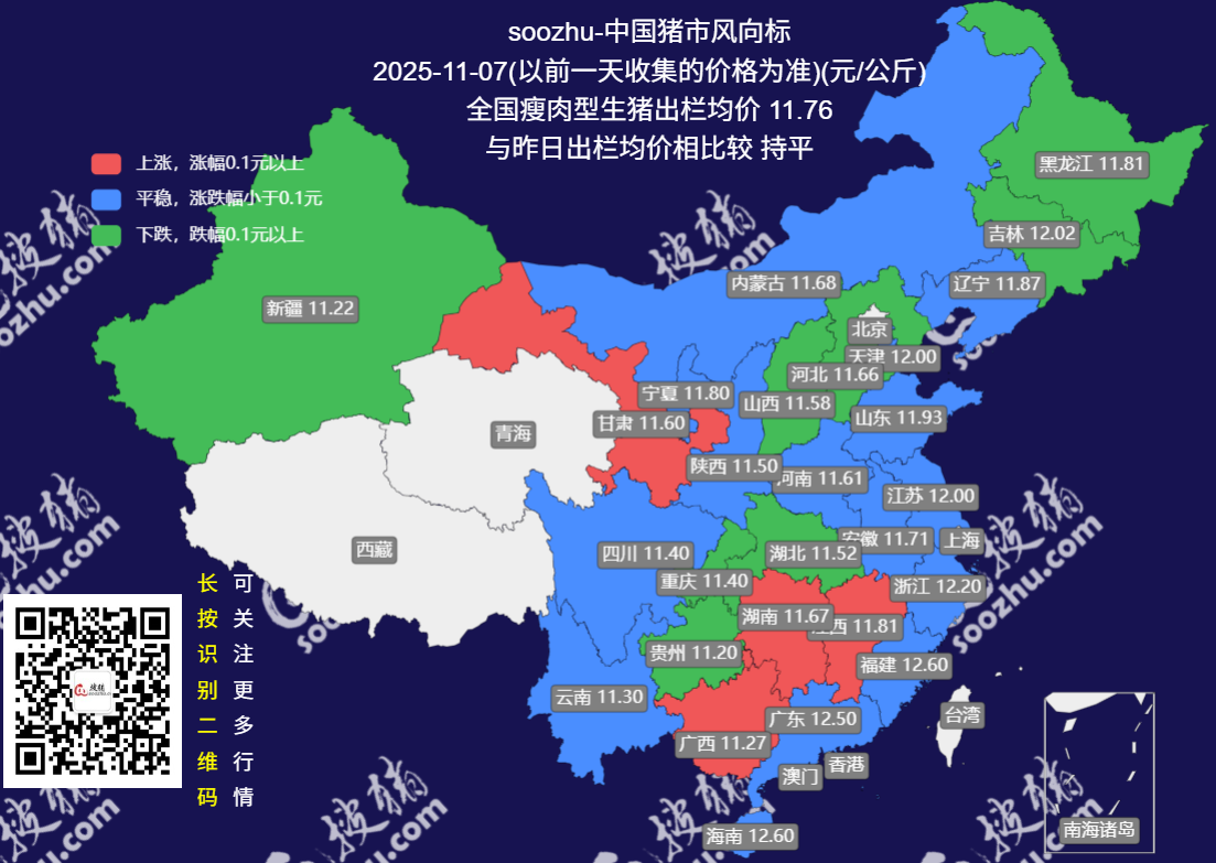今日全国瘦肉型猪出栏均价11.76元/公斤,与昨日持平[详情]