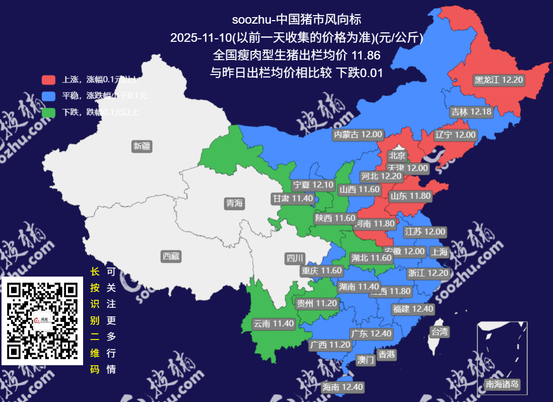 今日全国瘦肉型猪出栏均价11.86元/公斤,较昨日下跌了0.01元/公斤[详情]