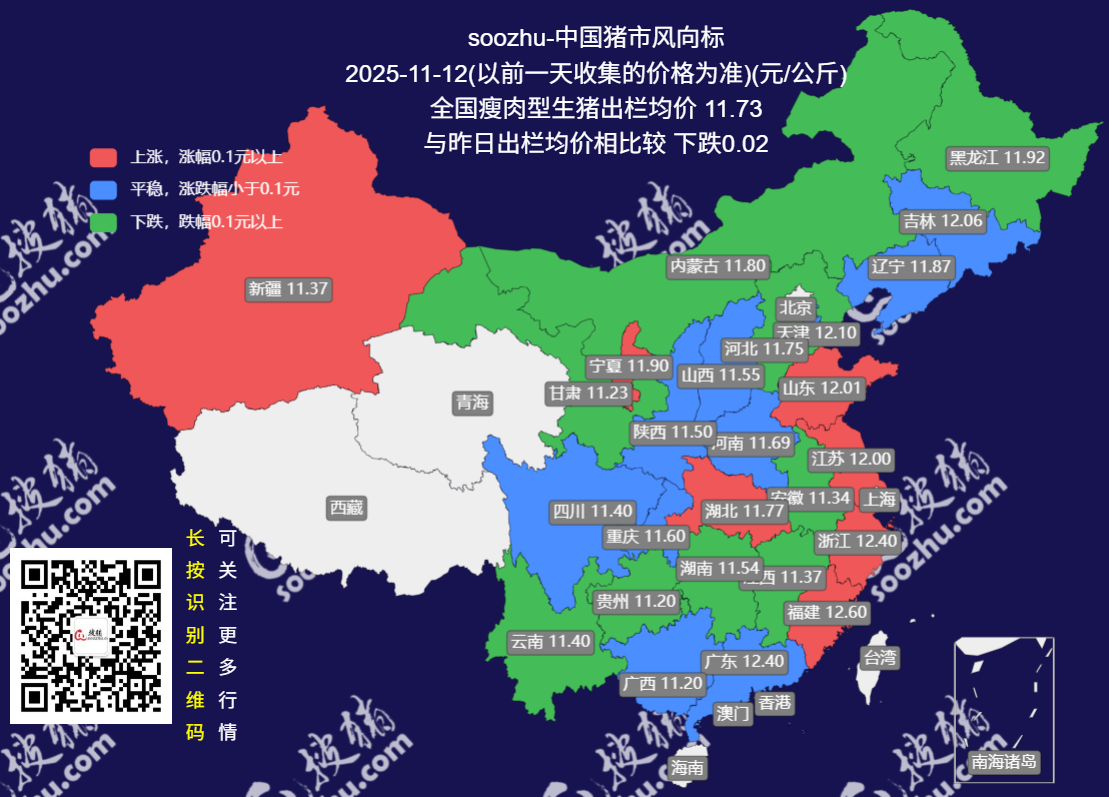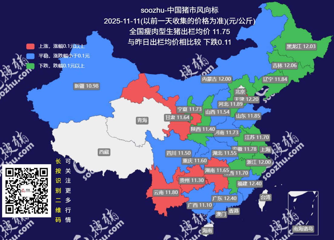 今日全国瘦肉型猪出栏均价11.75元/公斤,较昨日下跌了0.11元/公斤[详情]