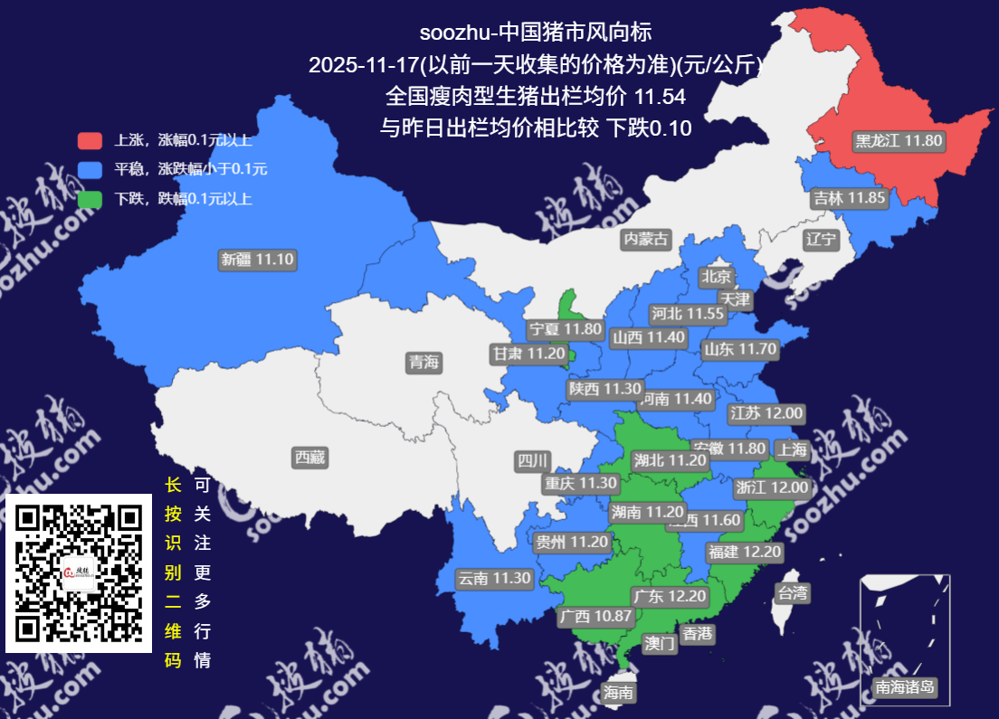 今日全国瘦肉型猪出栏均价11.54元/公斤,较昨日下跌了0.1元/公斤[详情]