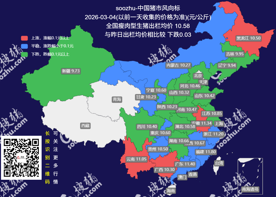 今日全国瘦肉型猪出栏均价10.58元/公斤,较昨日下跌了0.03元/公斤[详情]