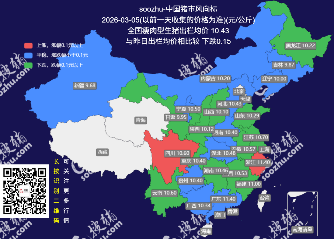 今日全国瘦肉型猪出栏均价10.43元/公斤,较昨日下跌了0.15元/公斤[详情]