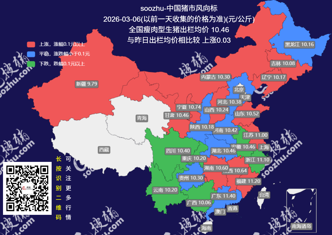 今日全国瘦肉型猪出栏均价10.46元/公斤,较昨日上涨了0.03元/公斤[详情]