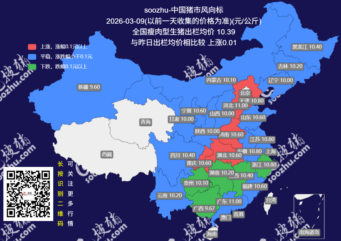 今日全国瘦肉型猪10.39元/公斤,较昨日上涨了0.01元/公斤[详情]