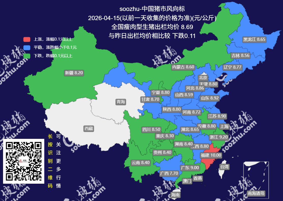 今日(2026 年 4 月 15 日),搜猪网最新监测显示,全国瘦肉型生猪出栏均价 8.60 元 / 公斤,较昨日(8.67 元 / 公斤)[详情]