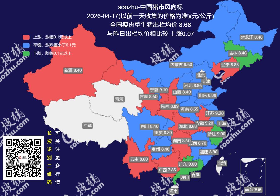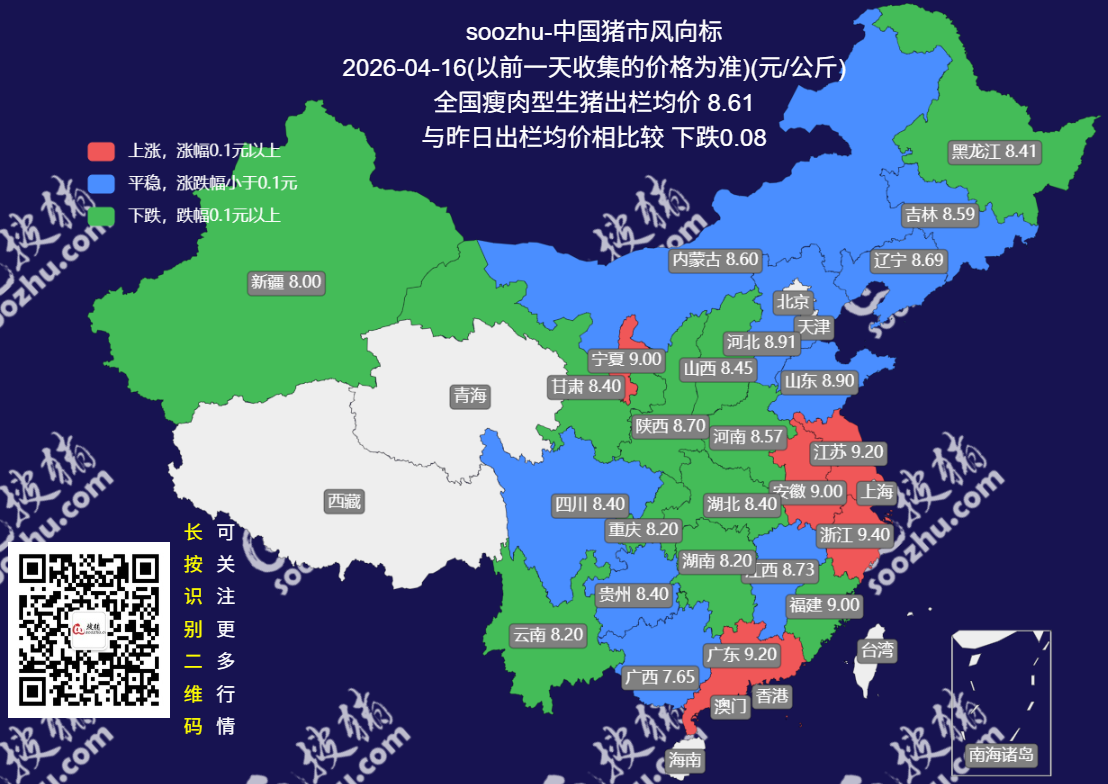 今日(2026 年 4 月 16 日),搜猪网最新监测显示,全国瘦肉型生猪出栏均价 8.68 元 / 公斤,较昨日(8.60 元 / 公斤)[详情]