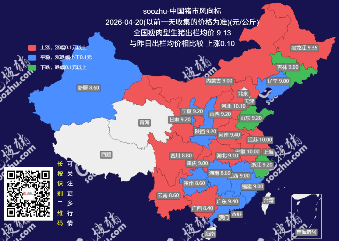 今日(2026 年 4 月 20 日),搜猪网最新监测显示,全国瘦肉型生猪出栏均价 9.49 元 / 公斤,较前期低点大幅回升,涨幅 3.9[详情]