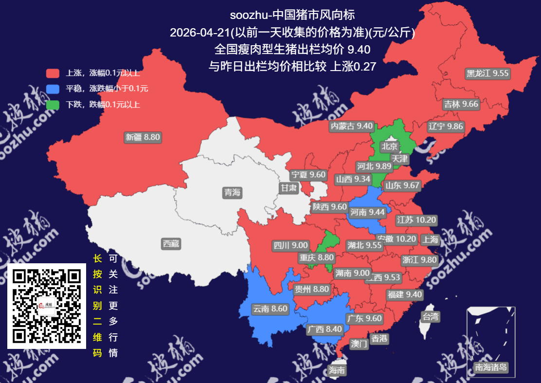 今日(2026 年 4 月 21 日),搜猪网最新监测显示,全国瘦肉型生猪出栏均价 9.42 元 / 公斤,较昨日微涨 0.02 元 / 公[详情]