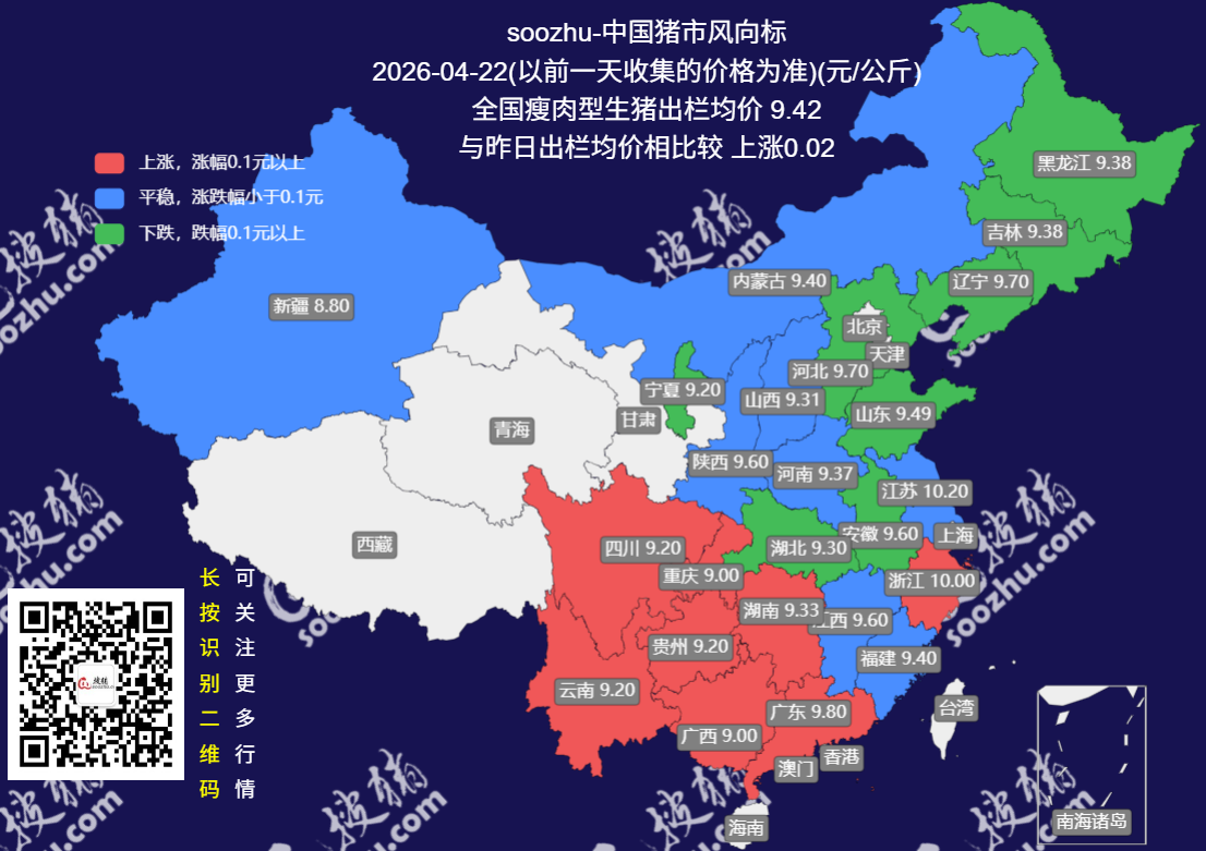 今日(2026 年 4 月 22 日),搜猪网最新监测显示,全国瘦肉型生猪出栏均价 9.38 元 / 公斤,较昨日(9.42 元 / 公斤)[详情]