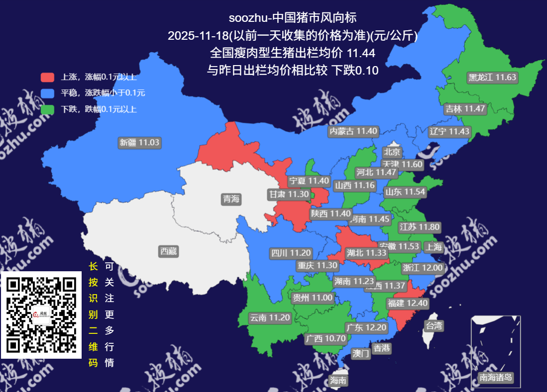 今日全国瘦肉型猪出栏均价11.44元/公斤,较昨日下跌了0.1元/公斤[详情]