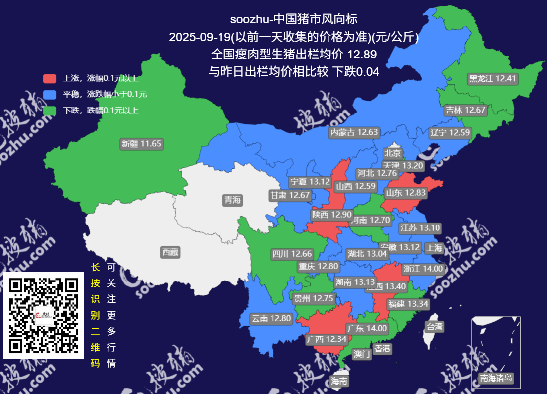 今日全国瘦肉型猪出栏均价12.93元/公斤,较昨日下跌了0.18元/公斤[详情]