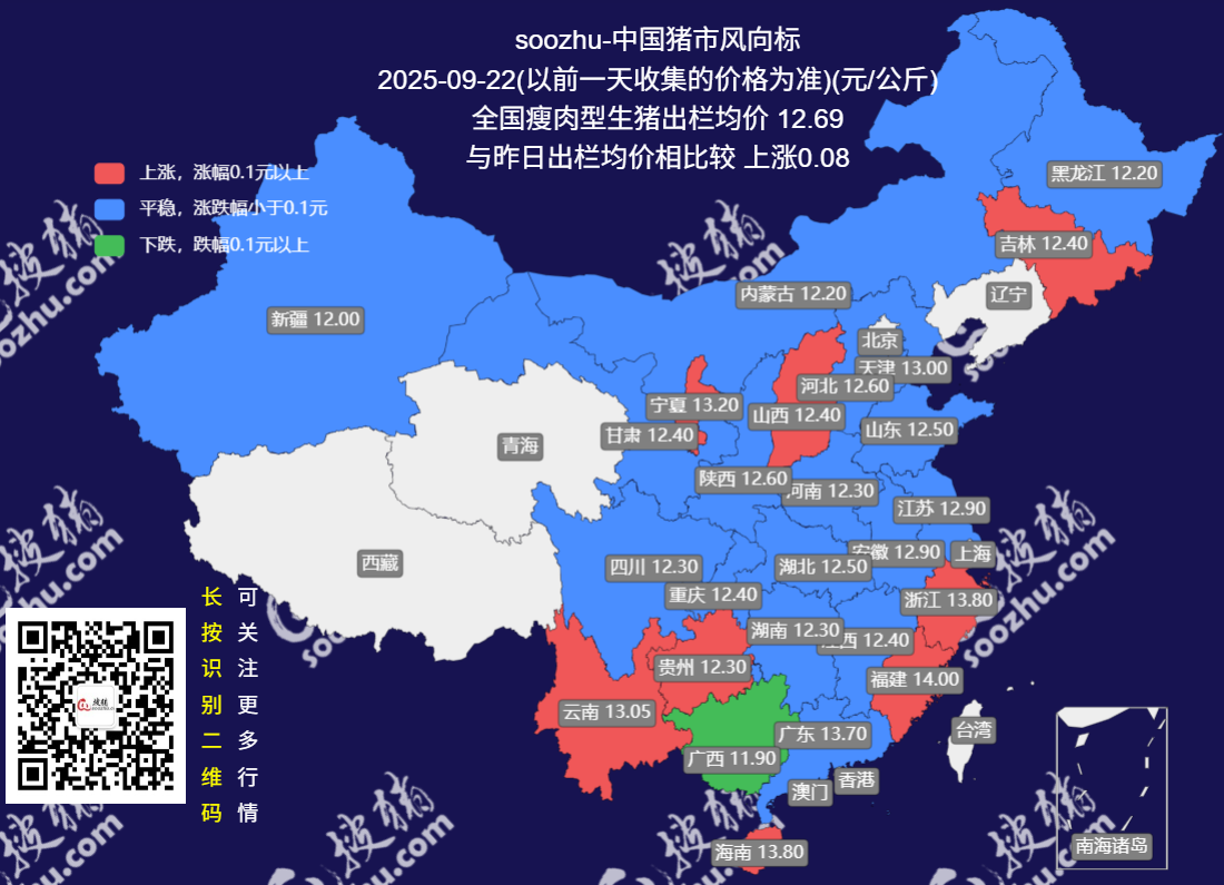 今日全国瘦肉型猪出栏均价12.69元/公斤,较昨日上涨了0.08元/公斤[详情]