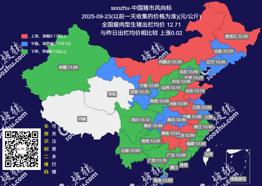 今日全国瘦肉型猪出栏均价12.71元/公斤,较昨日上涨了0.02元/公斤[详情]