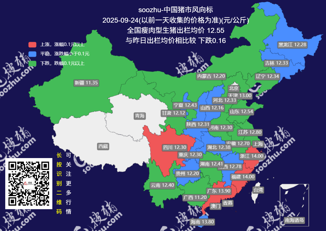 今日全国瘦肉型猪出栏均价12.55元/公斤,较昨日下跌了0.16元/公斤[详情]