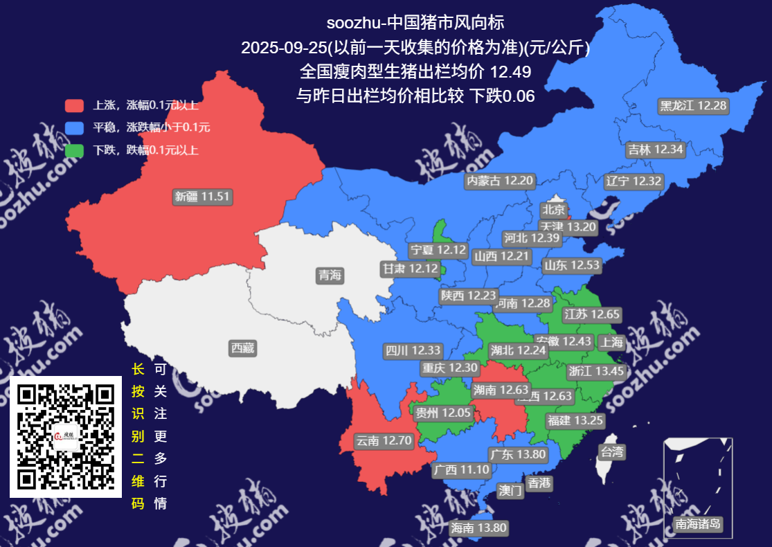 今日全国瘦肉型猪出栏均价12.49元/公斤,较昨日下跌了0.06元/公斤[详情]