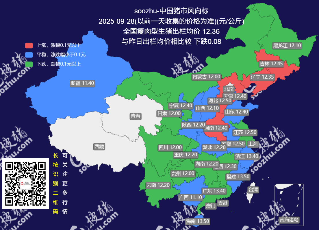 今日全国瘦肉型猪出栏均价12.36元/公斤,较昨日下跌了0.08元/公斤[详情]