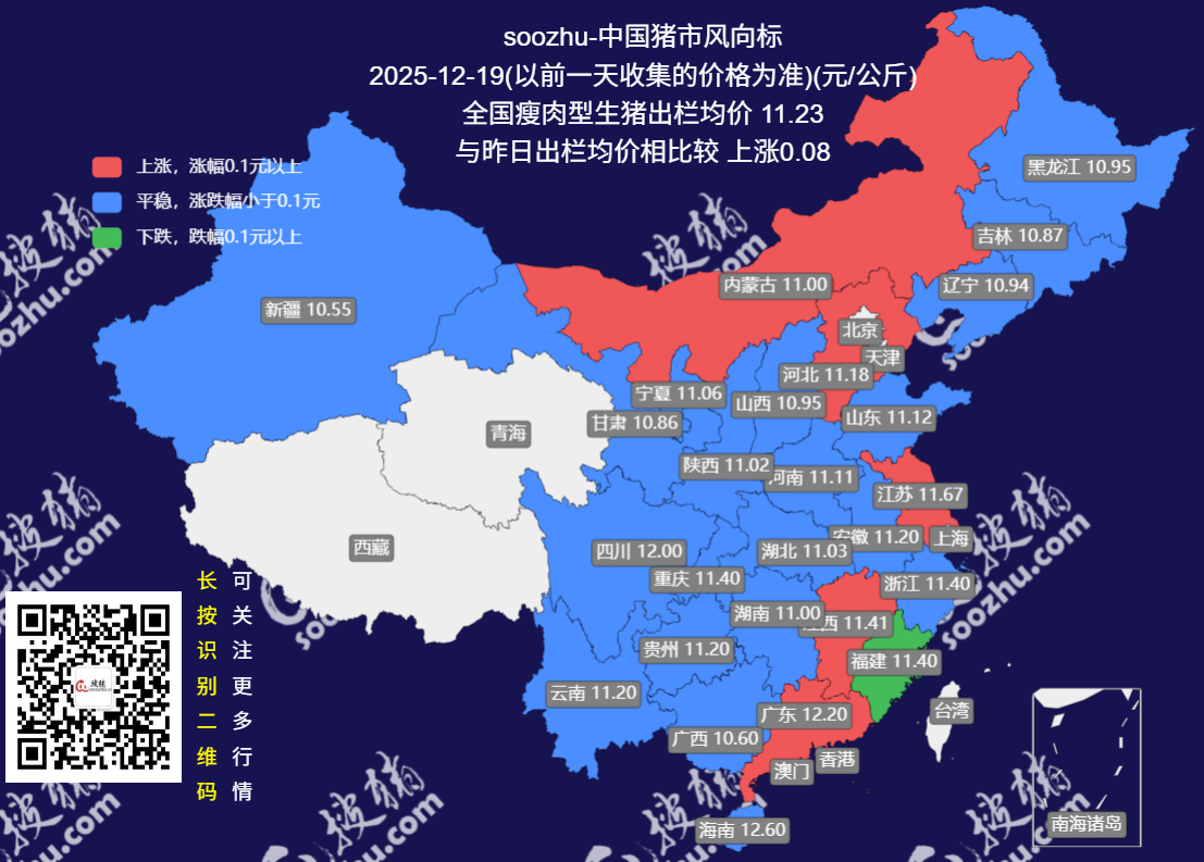 今日全国瘦肉型猪出栏均价11.19元/公斤,较昨日上涨了0.12元/公斤[详情]
