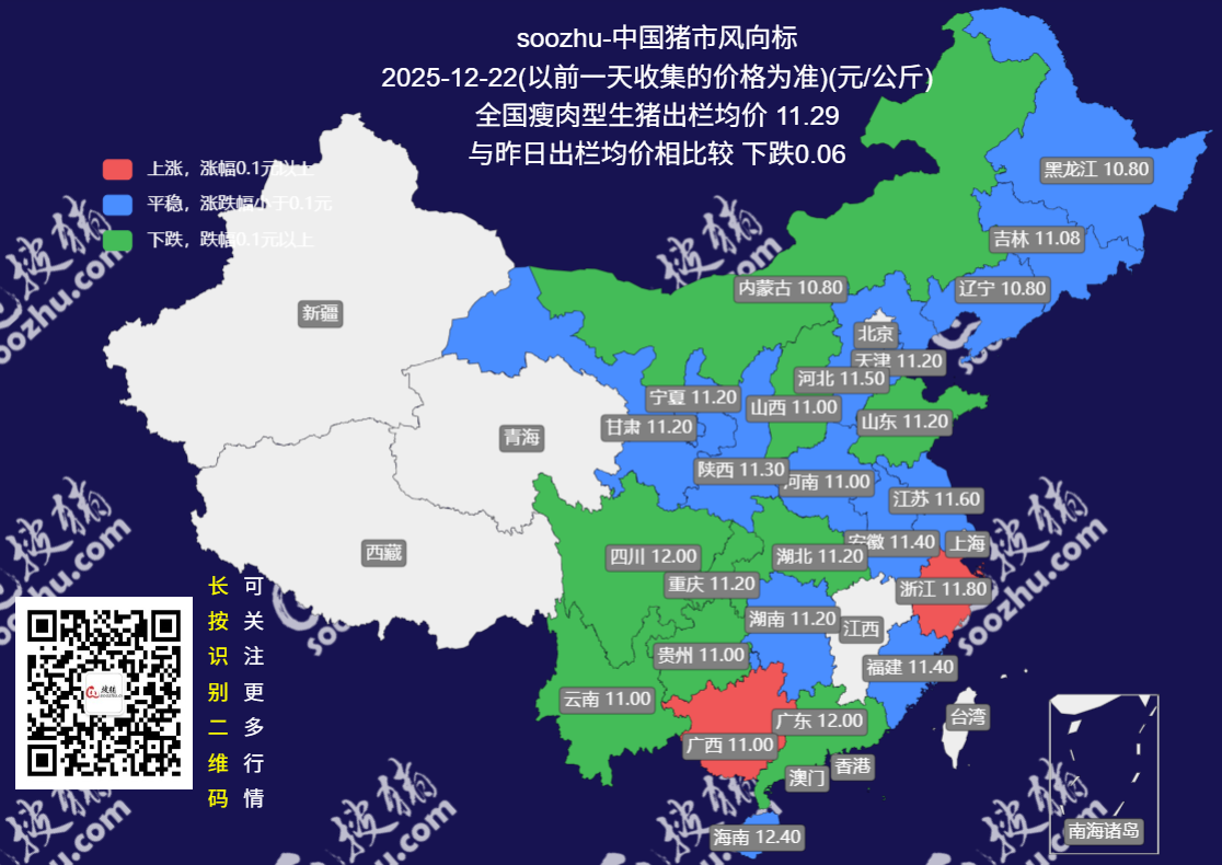 今日全国瘦肉型猪出栏均价11.29元/公斤,较昨日下跌了0.06元/公斤[详情]
