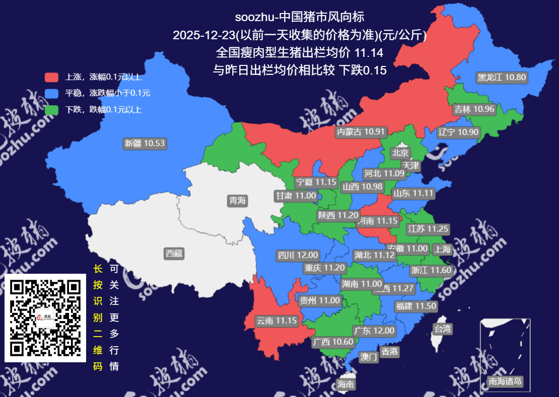 今日全国瘦肉型猪出栏均价11.15元/公斤,较昨日下跌了0.04元/公斤[详情]