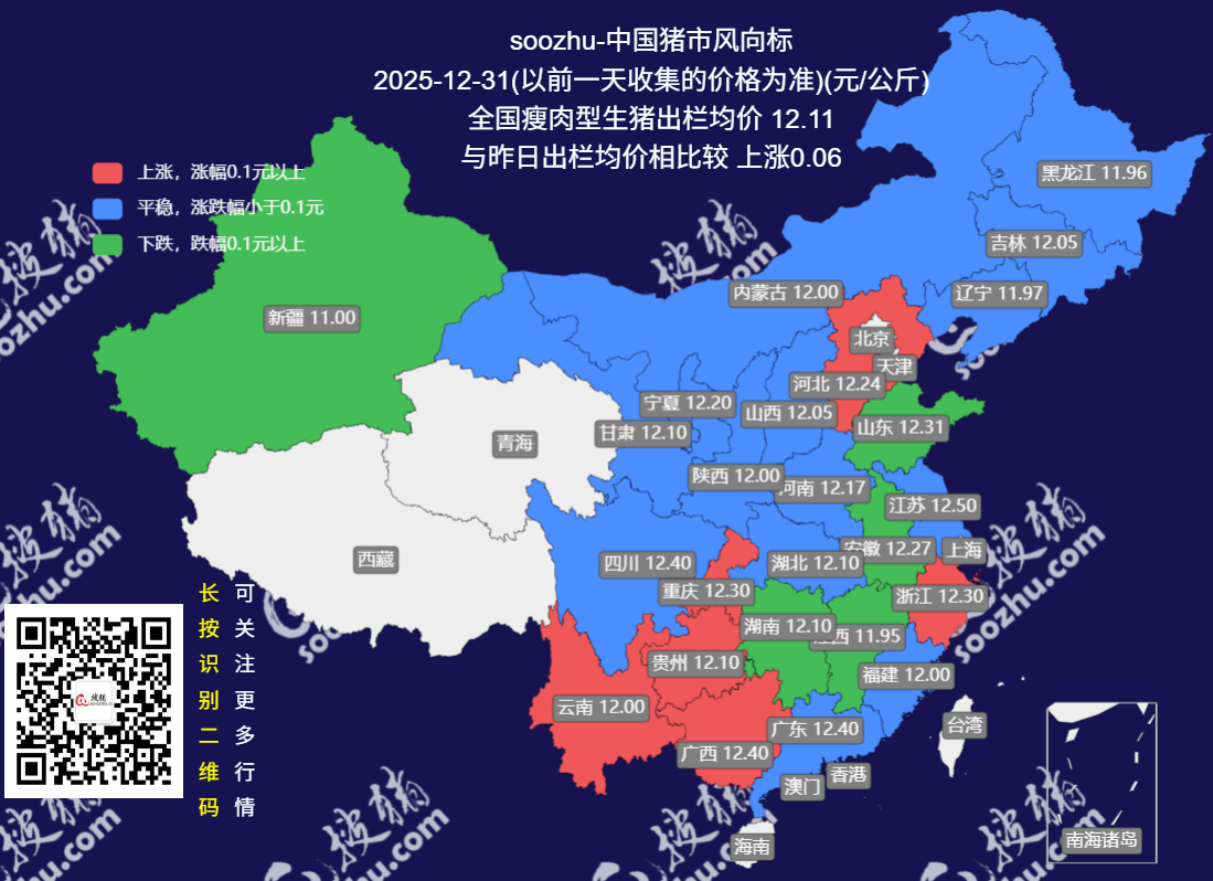 今日全国瘦肉型猪出栏均价12.11元/公斤,较昨日上涨了0.06元/公斤[详情]