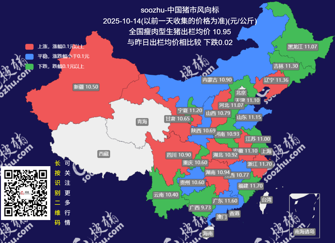 10月14日生猪日报:今日全国瘦肉型猪出栏均价10.95元/公斤