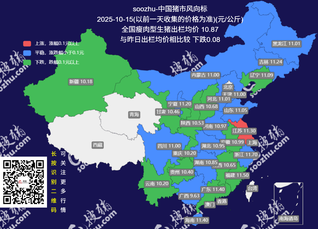 10月15日生猪日报:今日全国瘦肉型猪出栏均价10.87元/公斤