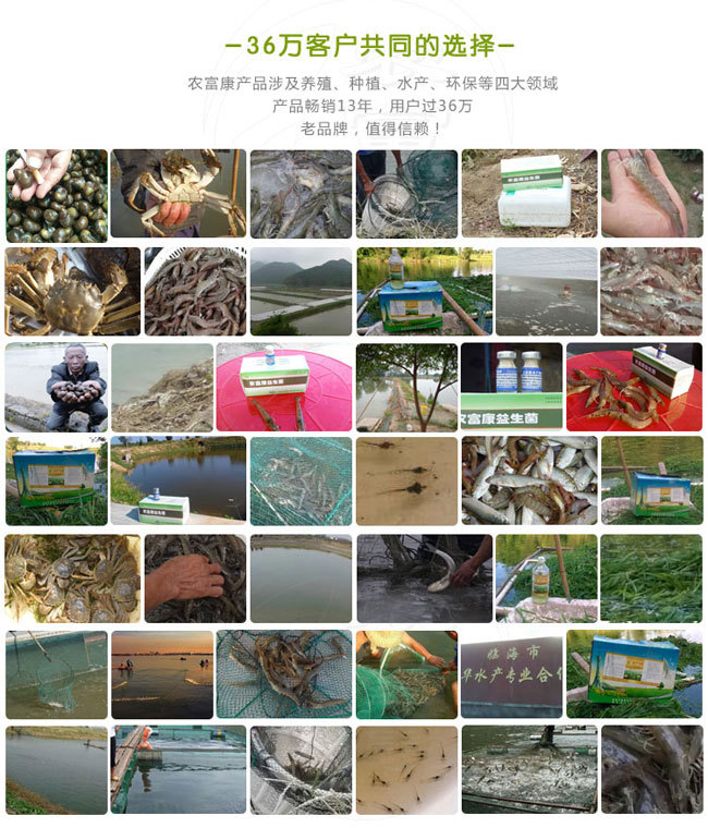 农富康水产菌种还可用于鱼、虾、蟹、蛙、海参、泥鳅等水产养殖,生产销售13年来,积累用户36万,80%回头客,大厂家产品值得信赖