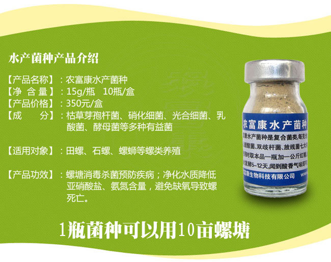 农富康水产菌种每克活菌量不低于200亿,1瓶可以就可以用10亩螺塘,杀菌净水,成本低,操作简单!!